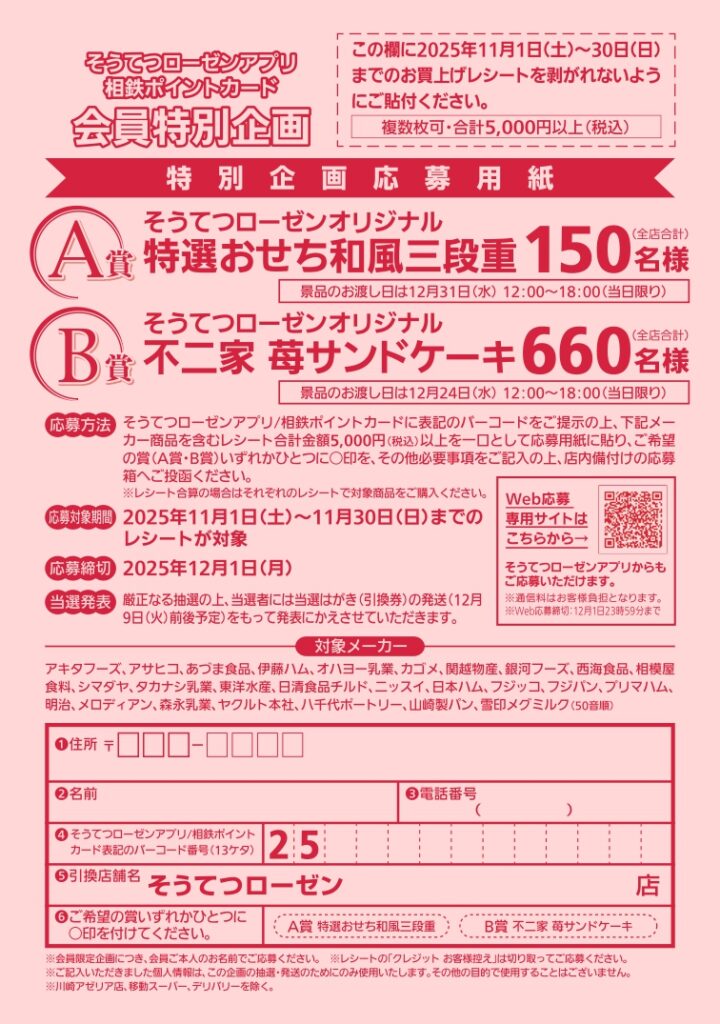 そうてつローゼンアプリ/相鉄ポイントカードに表記のバーコードをご提示の上、下記メーカー商品を含んだレシート合計金額5,000円(税込)以上お買上のレシートで応募できます。
