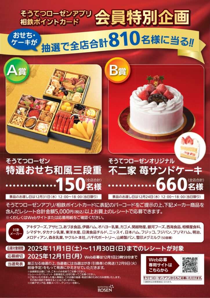 そうてつローゼンでは、そうてつローゼンアプリ/相鉄ポイントカード会員様に、おせちとクリスマスケーキが抽選で810名様に当る特別企画を実施中です!