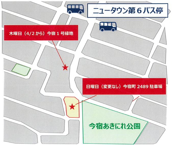 | 4月2日(木)以降 | 今宿1号緑地 (今宿二丁目2432番1) | 今宿町2489駐車場 (変更なし) |